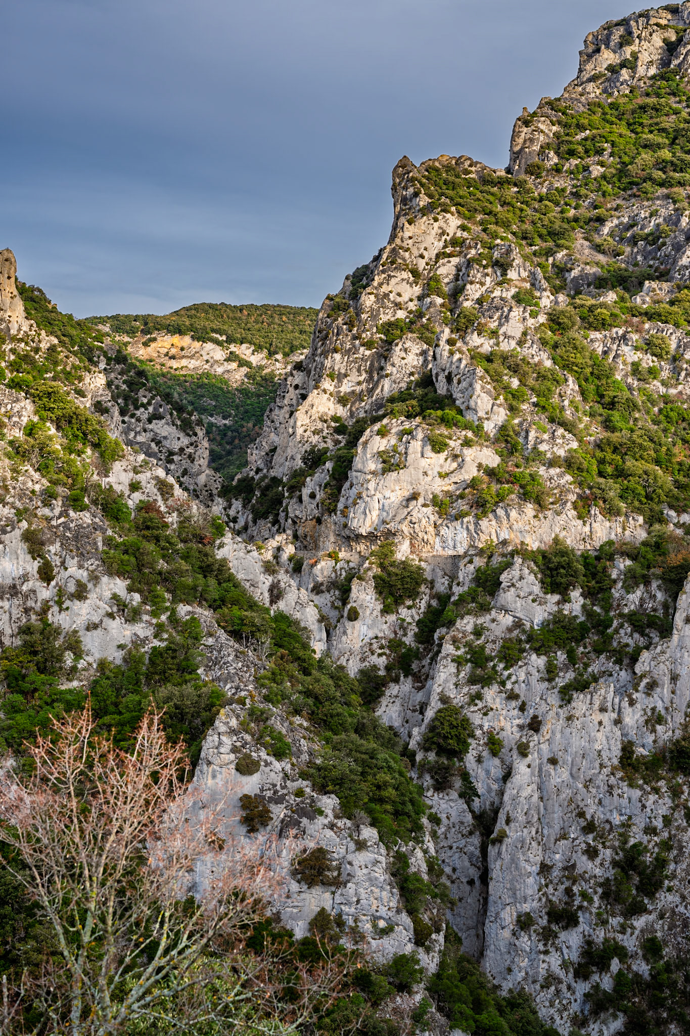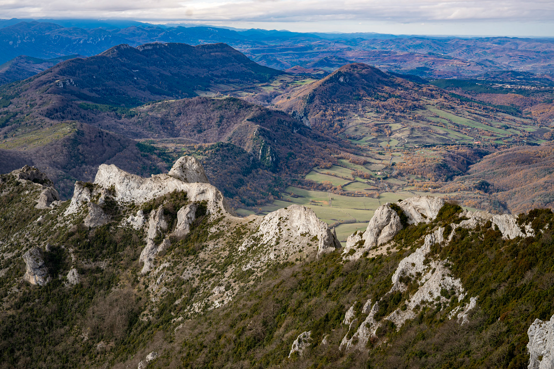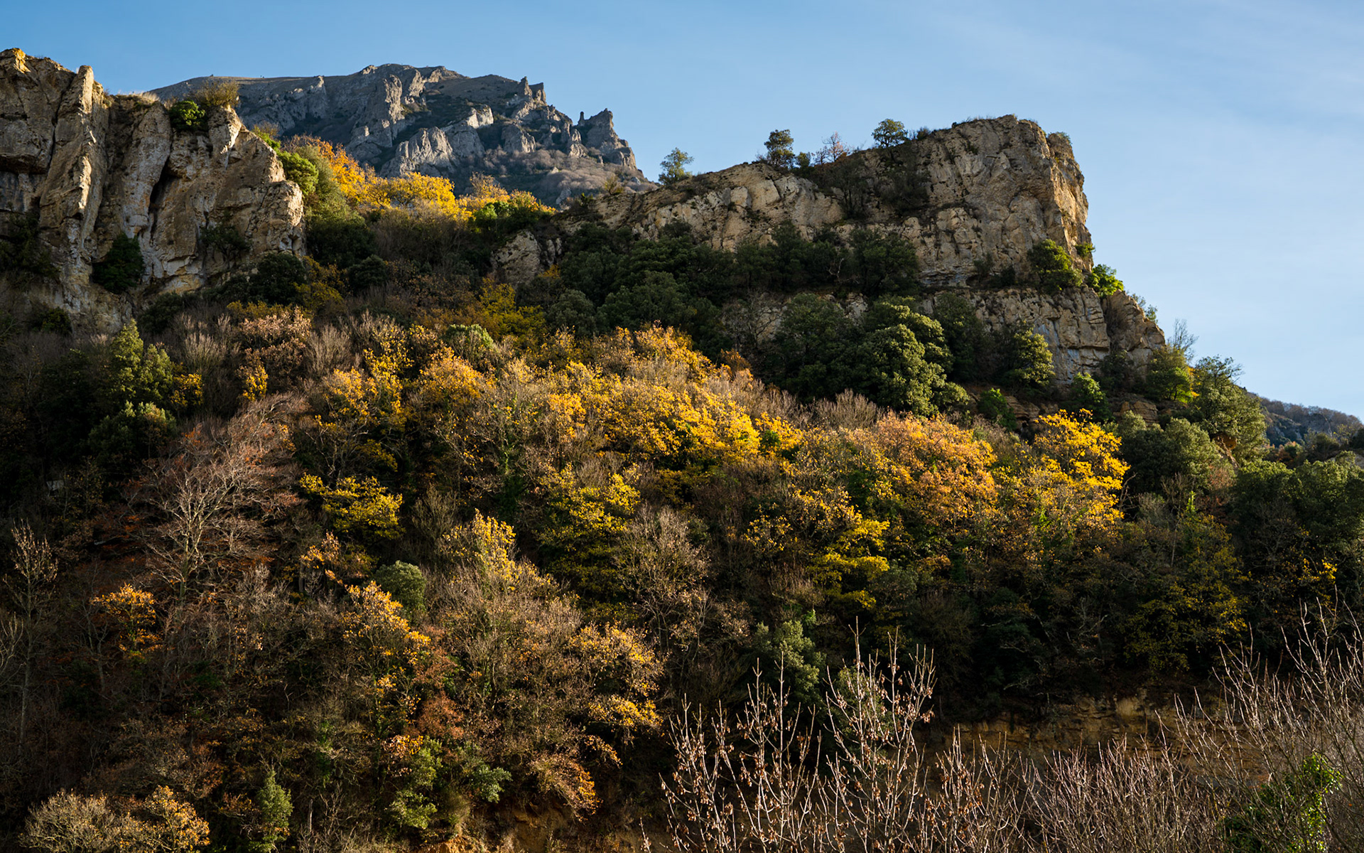 The Corbières are a mountain region in the Languedoc-Roussillon in southeastern France, located in the departements of Aude and Pyrénées-Orientales. The river Aude borders the Corbières to the west and north, and the river Agly more or less to the south. The eastern border is the Mediterranean Sea. The eastern part of the Corbières bordering the Mediterranean and the Etangs is also known as the Corbières Maritimes; its climate and vegetation (thermo-mediterranean vegetation) are distinct from those in the western part. It is the only true foothill of the Pyrenees on their northern side. The highest point of the Corbières is the 1,230 m high Pic de Bugarach.
