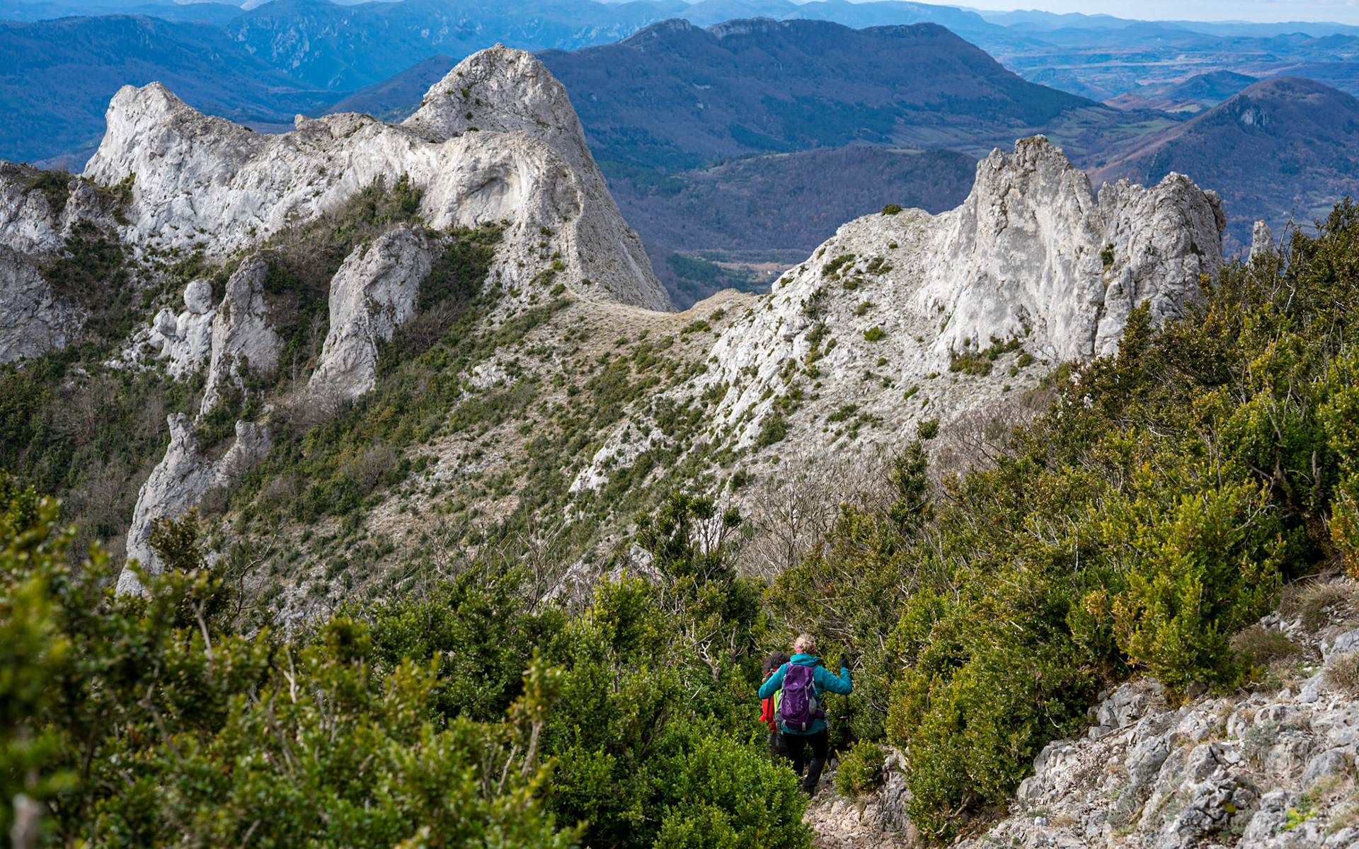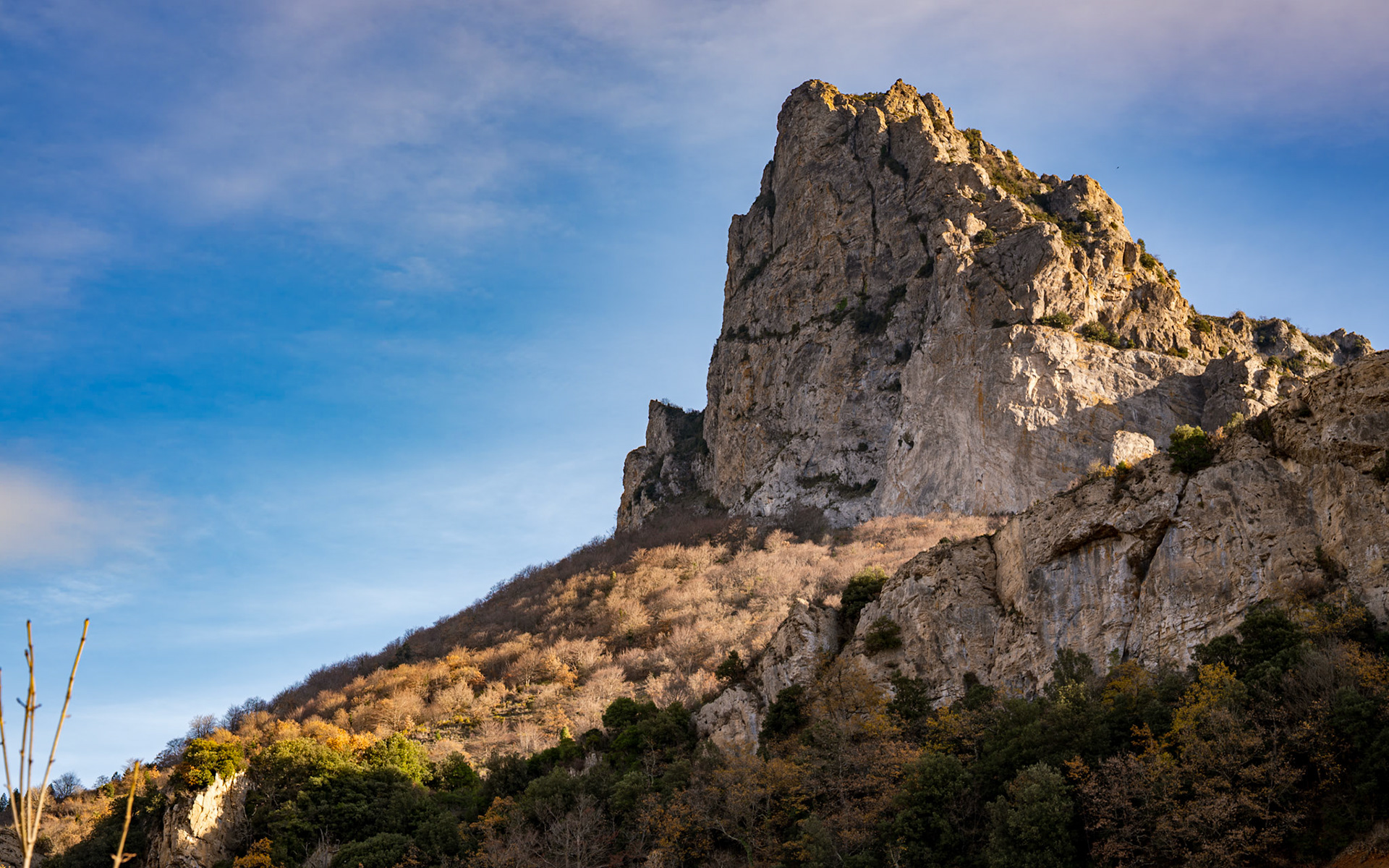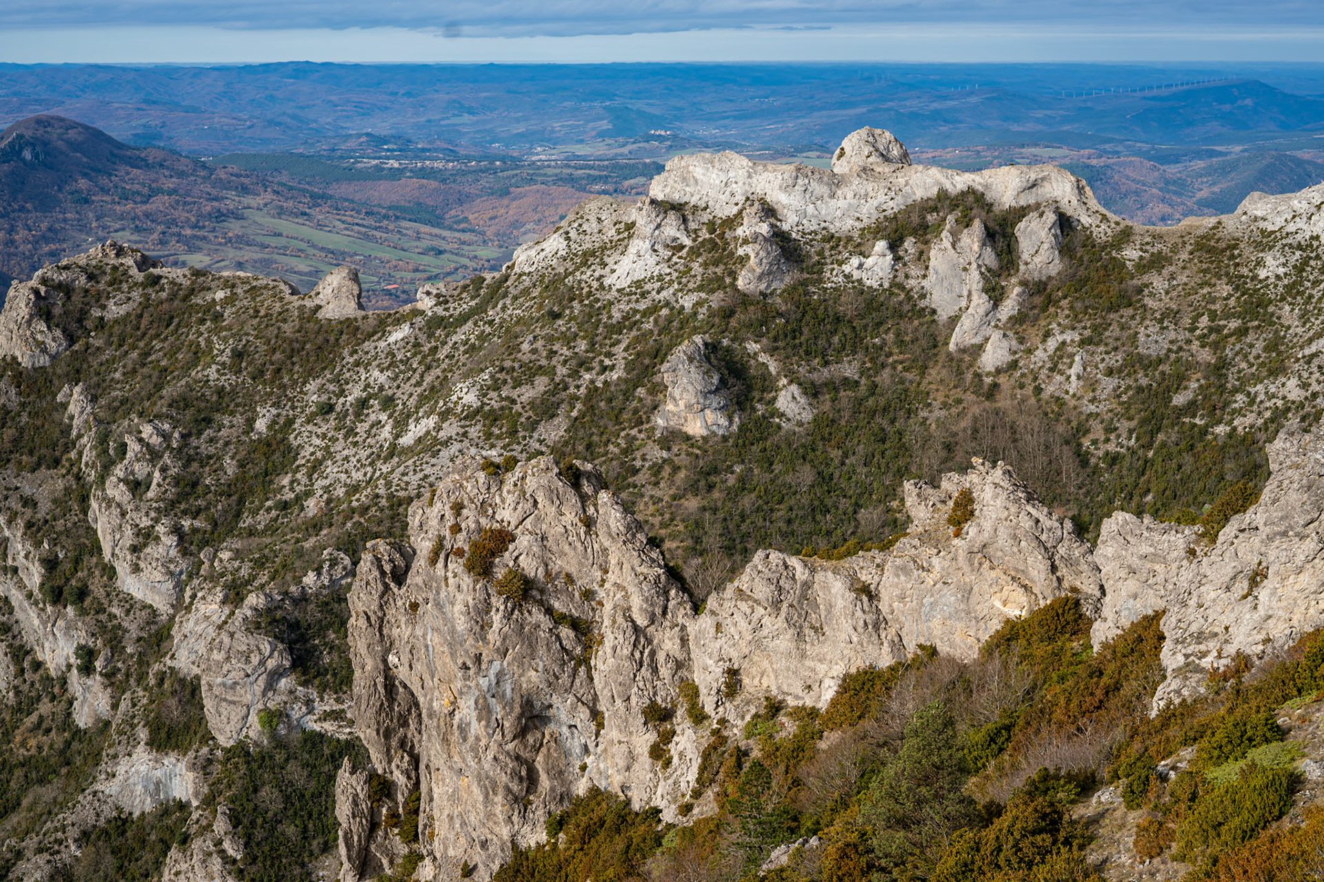 The Corbières are a mountain region in the Languedoc-Roussillon in southeastern France, located in the departements of Aude and Pyrénées-Orientales. The river Aude borders the Corbières to the west and north, and the river Agly more or less to the south. The eastern border is the Mediterranean Sea. The eastern part of the Corbières bordering the Mediterranean and the Etangs is also known as the Corbières Maritimes; its climate and vegetation (thermo-mediterranean vegetation) are distinct from those in the western part. It is the only true foothill of the Pyrenees on their northern side. The highest point of the Corbières is the 1,230 m high Pic de Bugarach.